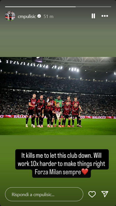 Christian Pulisic ha affidato ai social il suo messaggio dopo l’errore dagli undici metri in Juventus-Milan, gara terminata a reti bianche. L’attaccante rossonero, protagonista negativo dell’incontro per il rigore sbagliato, ha mostrato grande senso di responsabilità e attaccamento ai colori del Milan con parole sincere e dirette.